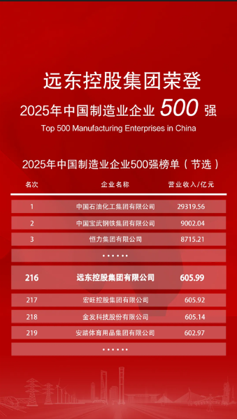 2025年9月20日,2025世界制造業(yè)大會在合肥盛大開幕。中國企業(yè)聯(lián)合會、中國企業(yè)家協(xié)會在大會開幕式上重磅發(fā)布“2025中國制造業(yè)企業(yè)500強”榜單,遠東控股集團憑借強勁的綜合實力位列榜單第216位,相較去年躍升13位,展現(xiàn)出企業(yè)在制造業(yè)領(lǐng)域持續(xù)進階的硬核實力。